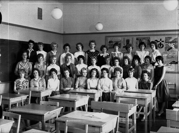 Engelbrektsskolan, klassrumsinteriör, 32 skolflickor med lärarinna fru Karin Gustafsson.