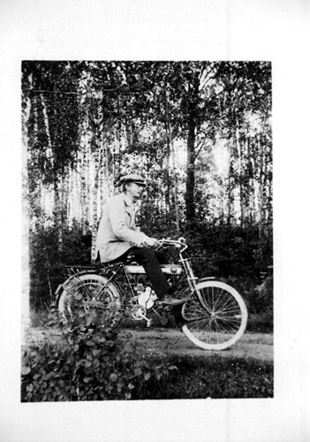 På provtur. Så här kunde det se ut efter vägarna vid sekelskiftet. Motorcykeln hade gjort sitt intåg. Gustaf Hammarlund född 1881, Södra Billinge, Närkes Kil, har varit i Örebro och lånat en "självgående cykel" över en helg.