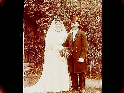 Titel: Brudpar, bruden i vit klänning, slöja och krona, brudgummen i frack och hög hatt. Emil Gustafsson