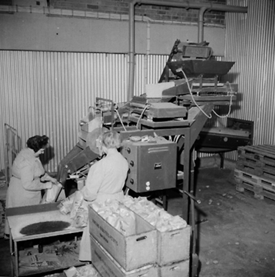Interiör, förpackning av potatis, två kvinnor.