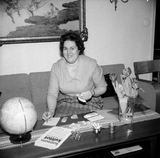 Konsums kvittoräkning, rumsinteriör, en kvinna.