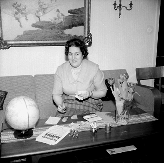 Konsums kvittoräkning, rumsinteriör, en kvinna.