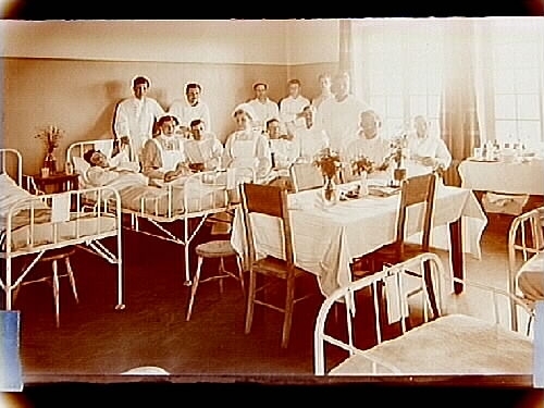 Sjukhus interiör, 12 soldater och 2 sjuksystrar.