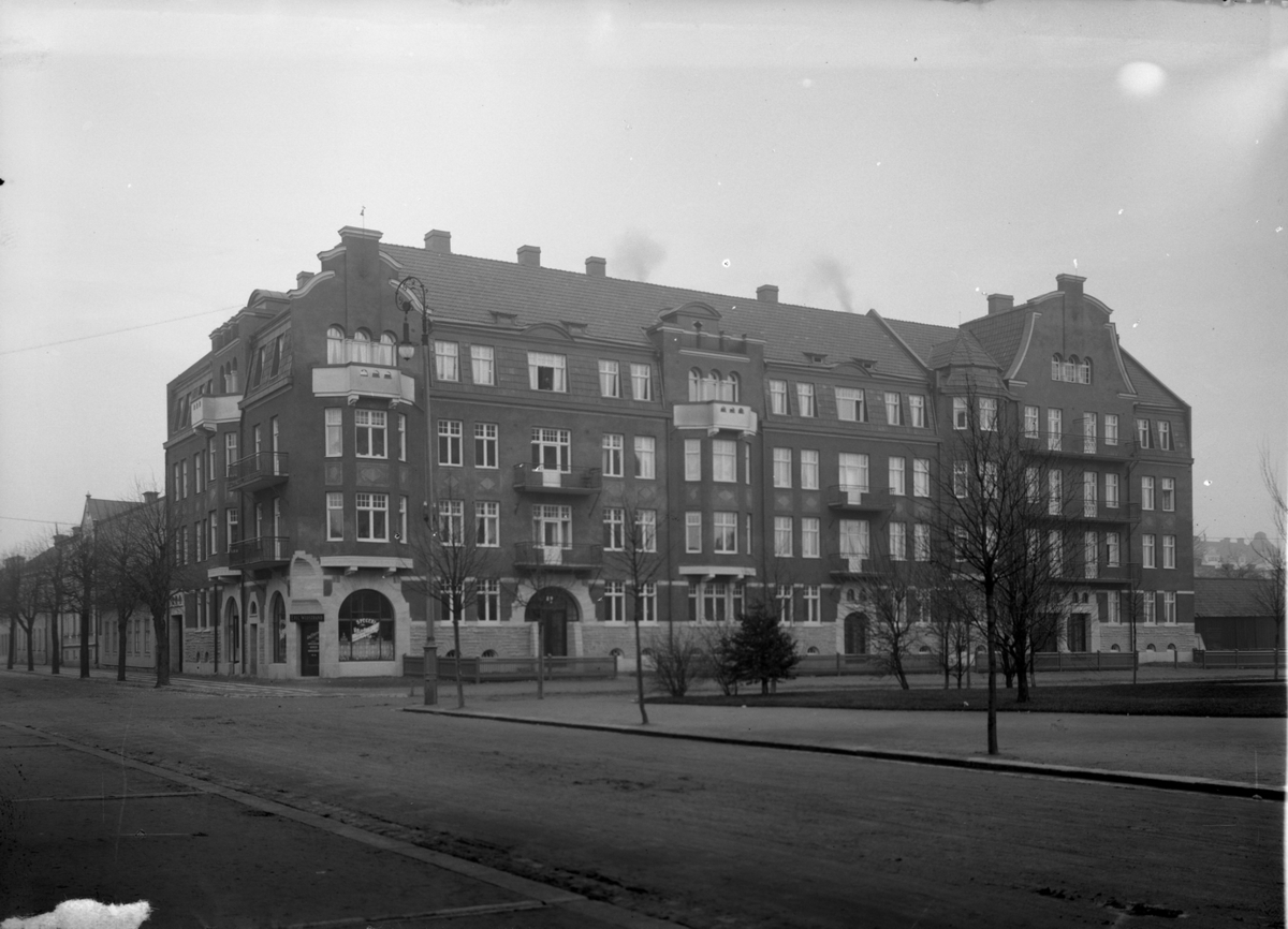Stenhus i fyra våningar med fasad i rödbrun slätputs, två frontespisar och balkonger.