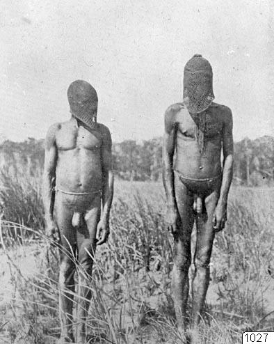 Yogodara (gaima)-män bärande nedfällda sorgnät. Gunnar Landtman: Ett sagoland och dess infödingar. Helsingfors 1931. Fig. 42, mellan pp. 136 o 137.