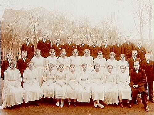 Ekeby konfirmander, 17 flickor, 14 pojkar och en präst.