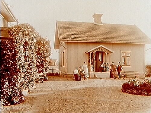 Envånings bostadshus med förstuga i snickarglädje, 6 personer framför huset.