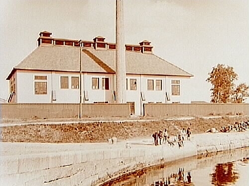 Skebäck, Glasbruket Viking Industri AB, tvåvånings fabriksbyggnad med hög skorsten.