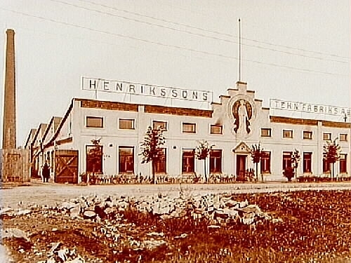 Henrikssons Kemiska Tekniska Fabriks AB, en och en halvvånings fabriksbyggnad med trappstegsgavel på framsidan och en målad kvinnogestalt med vågskålar i handen på framsidan av fabriken.