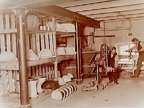 Värme & Sanitetstekniska anläggningar, interiör av verkstaden, 2 män.