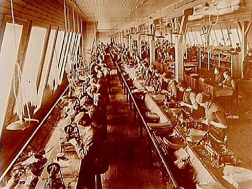 Nya Skofabriks AB Örnen, fabriksinteriör, nåtlingshallen med sömmerskor.