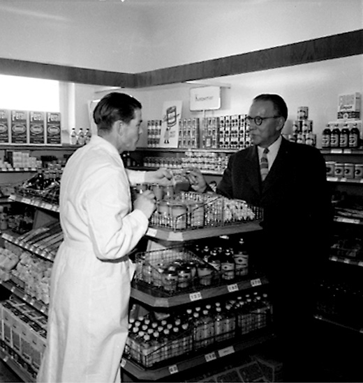 Titel: Konsum Lillån, affärsinteriör, två män.