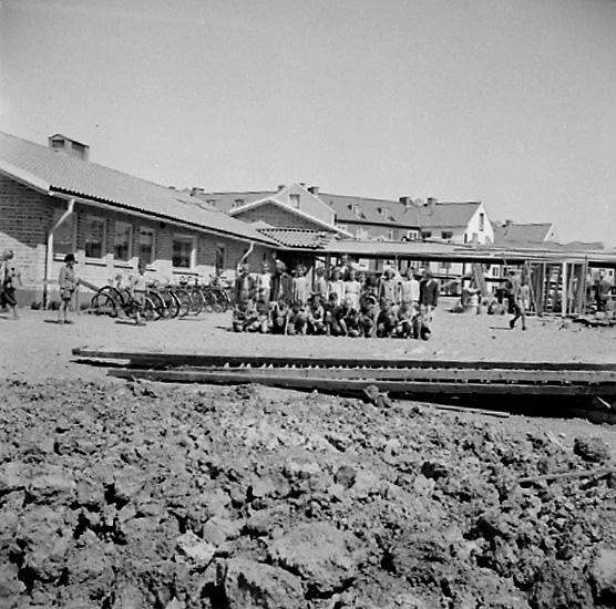 Titel: Hagaskolan, skolbarn med lärare på skolgården. Skolbyggnad i bakgrunden. Fröken Olsson