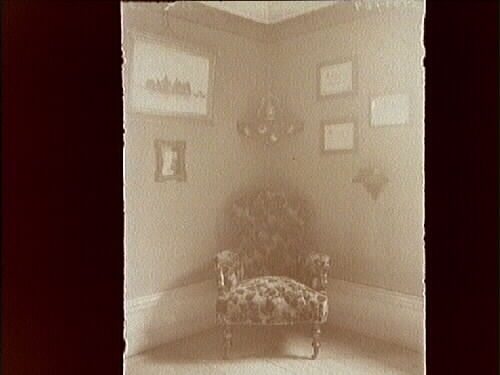 Rumsinteriör, en fåtölj, "Pappas (Johan Thermaenius) hörn i gamla hemmet".