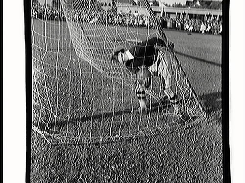 Fotboll vid Eyravallen. Målvakt Berndt Karlsson hämtar bollen i målet.
