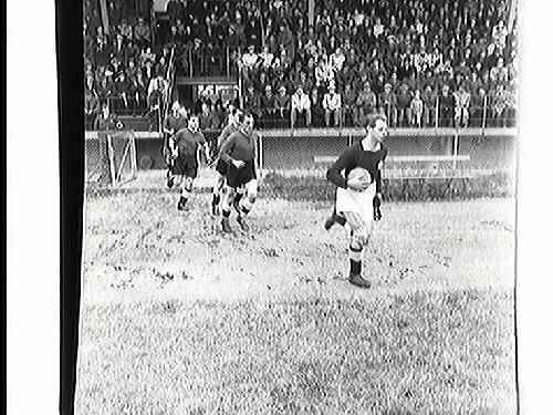 Berndt Karlsson följd av Sten Dahl och hela ÖSK-laget ut på fotbollsplanen vid Eyravallen.