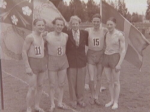 Friidrott, Hällefors. Närkes stafettlag 400 m. Fr.v. Lars-Erik Wolfbrandt, Lennart Johansson, tränare Evert Mattsson, Sven Malmberg, Alf Andersson (Linde).