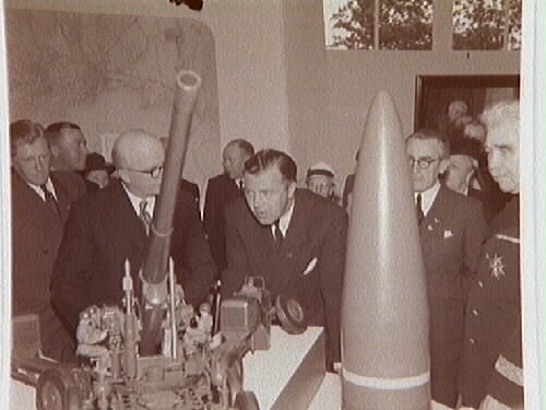 Örebroutställningen, Idrottshuset 1947. Prins Bertil beundrar Bofors monter.