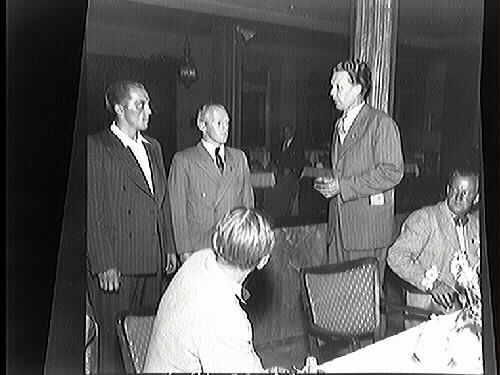 Titel: Sten Dahl och 'Klämmen' Pettersson får plakett av Närkes Fotbollsförbunds ordförande Alf Lindman vid Frimurarlogen.