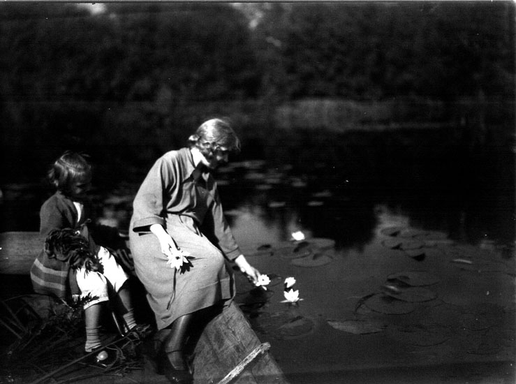Två flickor i en båt plockar näckrosor i Marksjön.