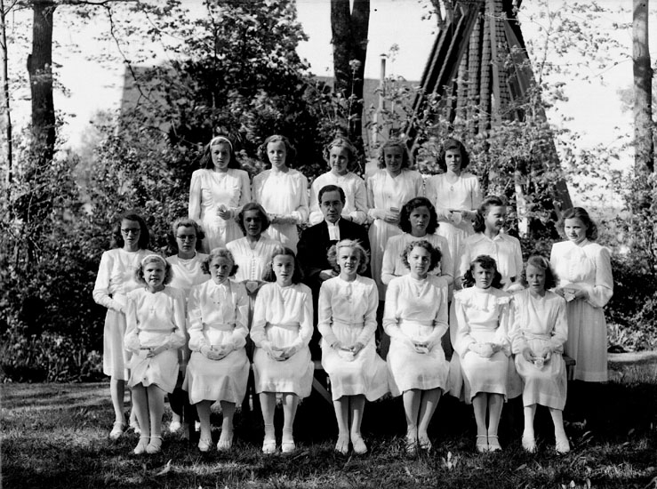 18 konfirmander, 18 flickor och pastor Hedberg.