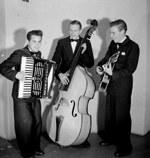 Sven Charlies Ensemble, Örebro. Fr. v. Sven Charlie Falk, dragspel och piano. Arne Olows, bas. Lasse Karlsson, gitarr och trumpet.