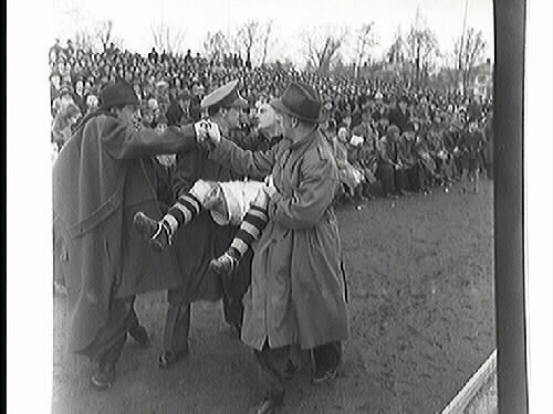 Gösta 'Pröjsarn' Nilsson fick bäras av plan till ambulans då han fått ett epileptiskt anfall vid match på Örnsro Idrottsplats.