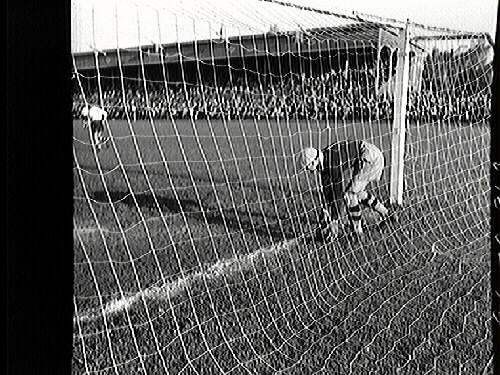ÖSK:s målvakt Berndt Karlsson hämtar bollen i målet.