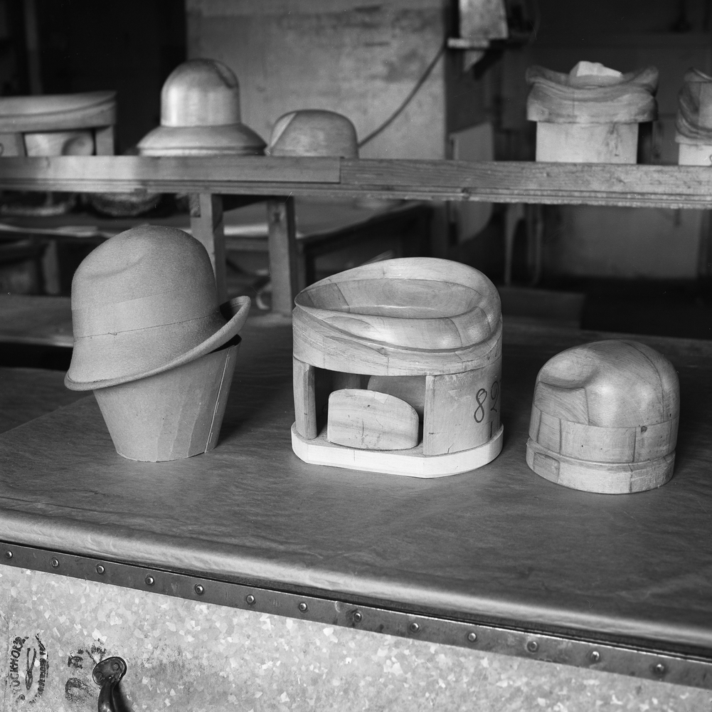 Lindbergs Strå- och Filth. Hattillverkning. 214/67 Så kallad öppen träform i två delar. Till höger hattkulle.