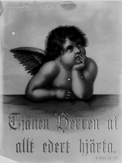 Religiös bild med texten: "tjänen Herren ut allt edert hjärta."