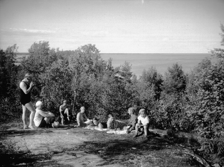 Familjen Lindskog och Källén vid Hjälmarbaden, 8 personer.