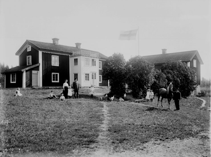 Bostadshus, barn och vuxna framför huset.