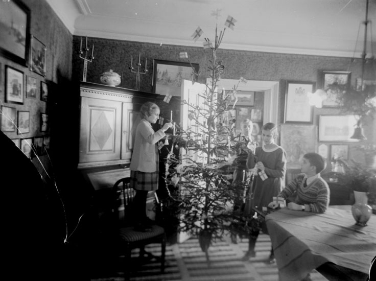 Rumsinteriör, fyra barn runt julgranen på juldagen.