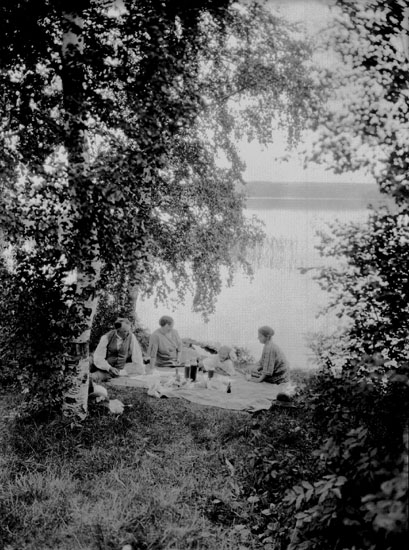 Fyra personer vid sjön Viker, kaffedrickande i gröngräset.