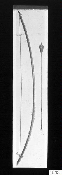 Båge och pil. Bågens längd: 1, 32 m. L. Schultze: Aus Namaland und Kalahari. Jena 1907. P. 101. Se text pp. 101 f.