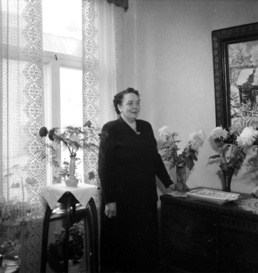 Titel: Rumsinteriör, en kvinna. Fru Fromell på födelsedagen.