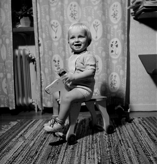 Rumsinteriör, en liten pojke med leksakshäst.