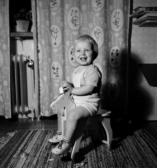 Rumsinteriör, en liten pojke med leksakshäst.