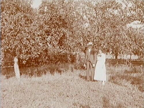 Jenny Larsson med en äldre man i trädgården