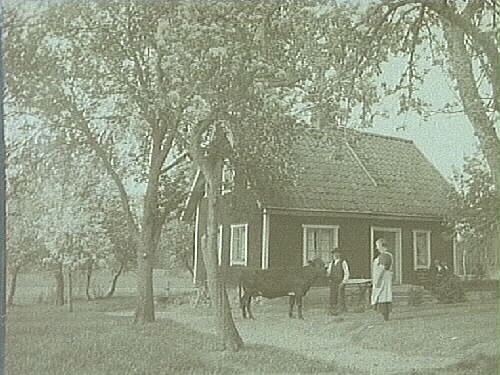 12 maj 1934. Man, kvinna och en ko framför ett hus.