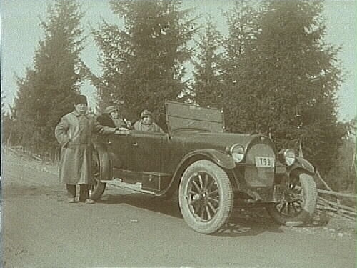 Jenny med sin mor i baksätet på bilen och herr Larsson står brevid.
