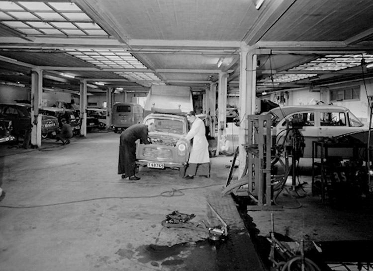 Görtz Motor AB, bilverkstad, verkstadsinteriör med arbetare.