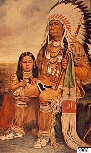 Oglalahövdingen Red Cloud med barnbarn. Ur publ. Rachlis, E.:Praerieindianerne, Köpenhamn 1960 sid 107. För utställningen "Indianernas Vilda Västern" i Kronhuset 1975.