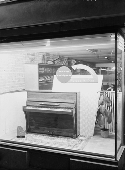 Skandia Musik AB, skyltfönster, musikinstrument.