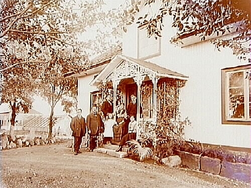 En och en halvplans bostadshus med frontespis, veranda med snickarglädje. Växthus.