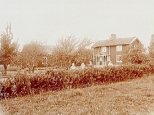 Envånings bostadshus, 4 personer framför huset.