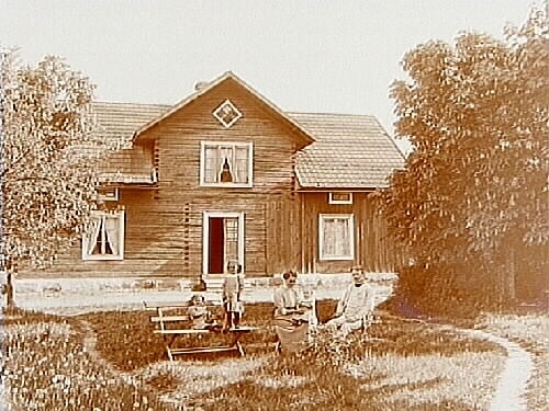 Ekeby Prostgård, en och en halvplans bostadshus med frontespis, timrad. Familjegrupp 5 personer på soffan framför huset.