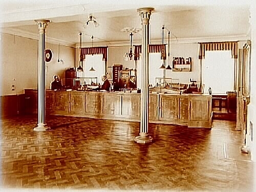 Hypoteksföreningen, interiör av banklokal, tre herrar.