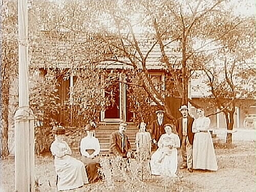 Sommarbostad, envånings stuga, 8 personer framför stugan.