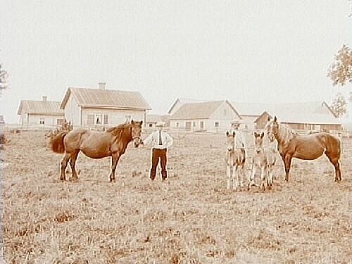 Två st. envånings bostadshus och ekonomibyggnader, två män med två ston och två föl.